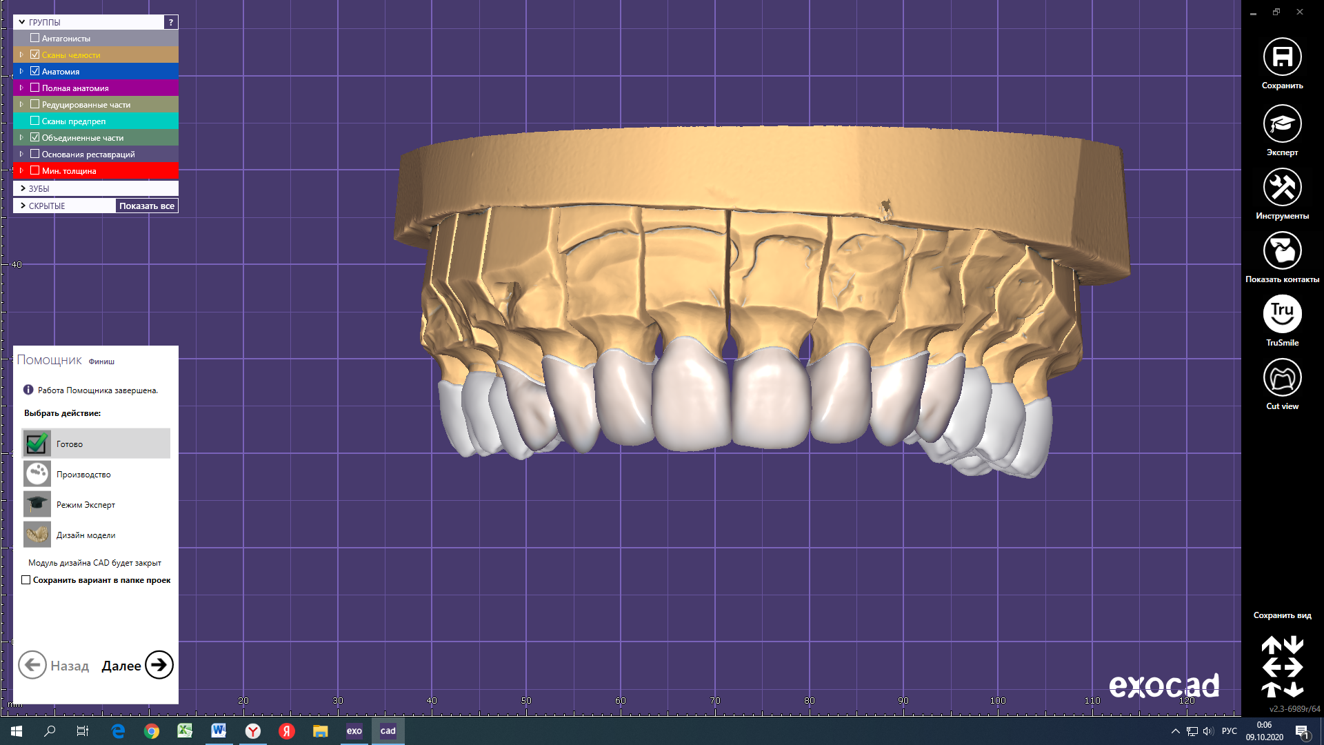 При изготовлении циркониевых коронок применяли цифровой метод изготовления. В программе ЭКЗОКАД ( EXOCAD) смоделирована работа на верхней челюсти, на фронтальных зубах сделана редукция.